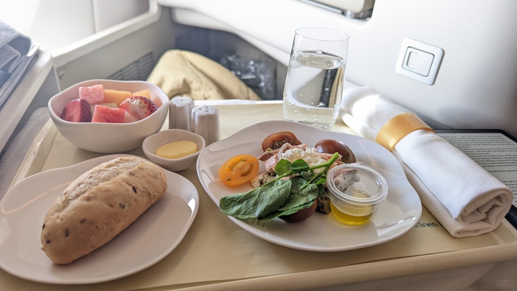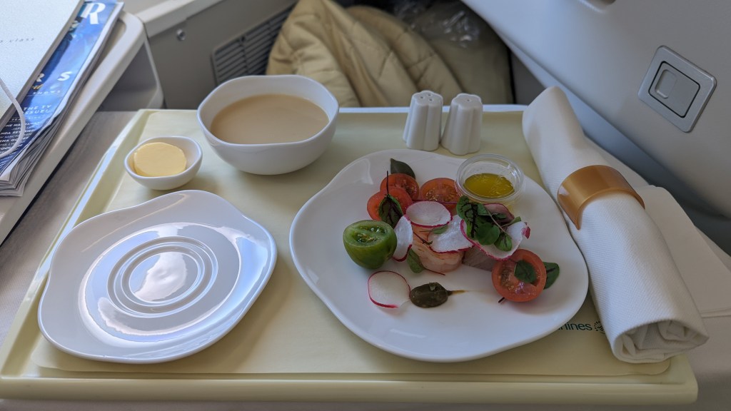 As this was a daytime flight, the main meal service was lunch which was a 4 course affair comprising an appetizer, soup, main course, dessert and a selection of breads. I didn’t get a picture of it but the garlic bread was INCREDIBLE. Choose this every time!