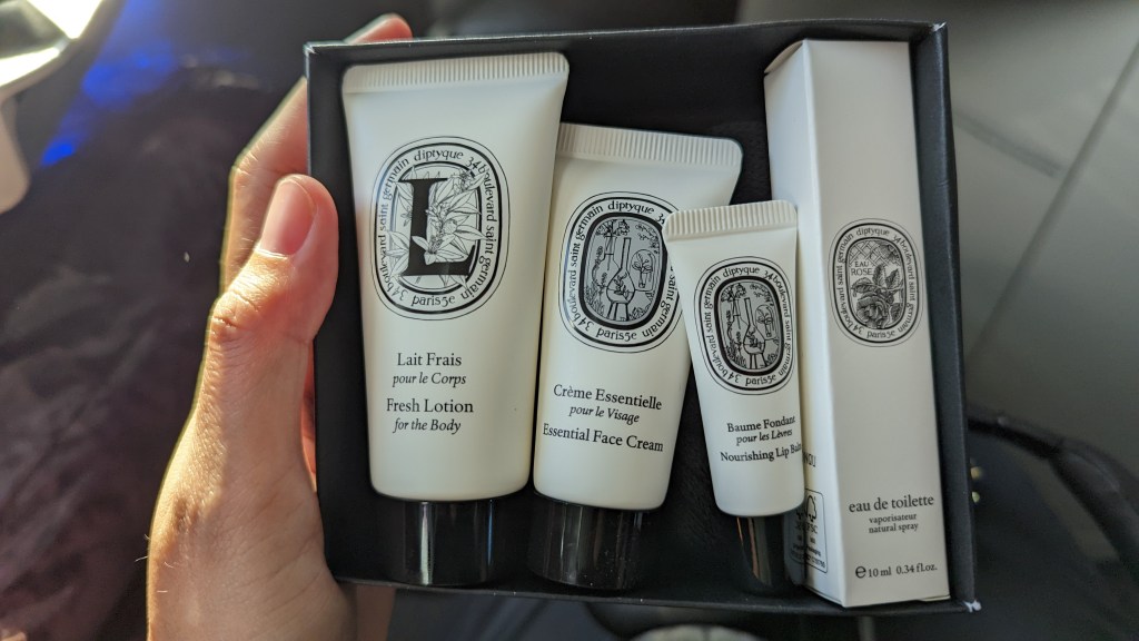 You’ll also find a very decent amenity kit for a 5 hour daytime flight – Diptyque body lotion, face cream, lip balm, eau de toilette spray and socks tucked at the bottom of the box. No pajamas were provided on this particular flight.