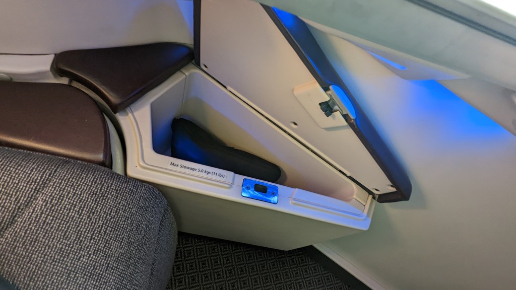 The seat has a good amount of storage space on either side of your seat, including a charging port, compartment that lights up when you open it (useful so you’re not fumbling around in the dark if a night time flight), and a nook underneath the foot rest for your shoes and blanket when not in use (side note: if you’re taking the A380, the seat is basically the same).