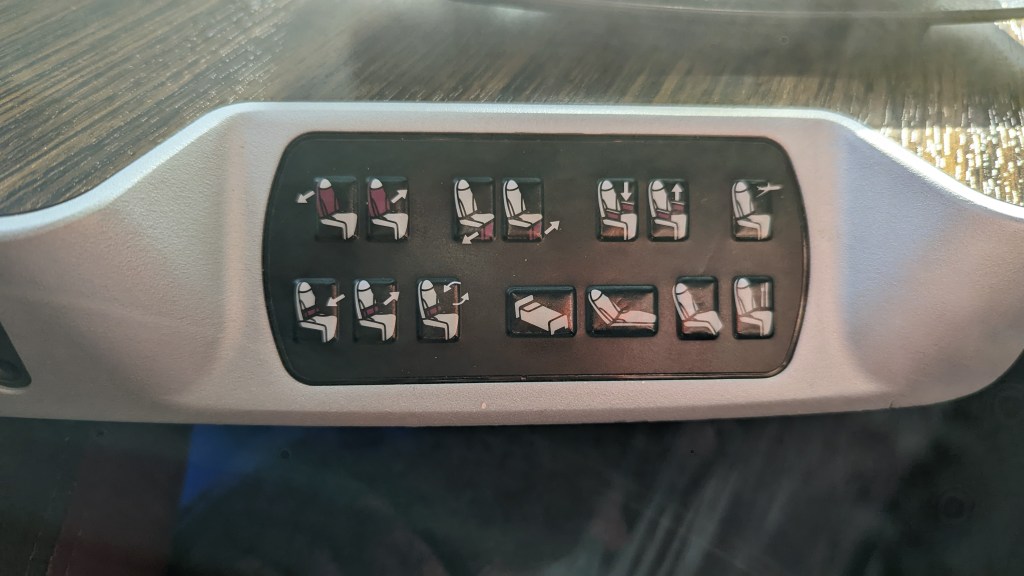 There is also a panel with one-touch recliner options for different modes such as take off, meal service, reclining and sleep. Of course, you can fully adjust everything but I found the one-touch modes super helpful to quickly snap into meal position when the FAs came around with plates!