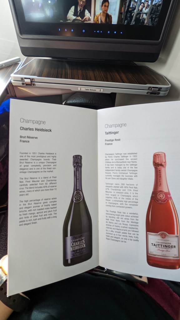 Qatar serves 2 types of champagne as part of pre-takeoff welcome drinks, both excellent – either a Charles Heidsieck Brut Reserve or a Taittinger Prestige Rose. This was offered with some warm almonds and cashews, perfectly roasted and not stale at all. Unfortunately I was not able to order my customary flight Bloody Mary as my FA said they couldn’t serve spirits until after midday…oh well.