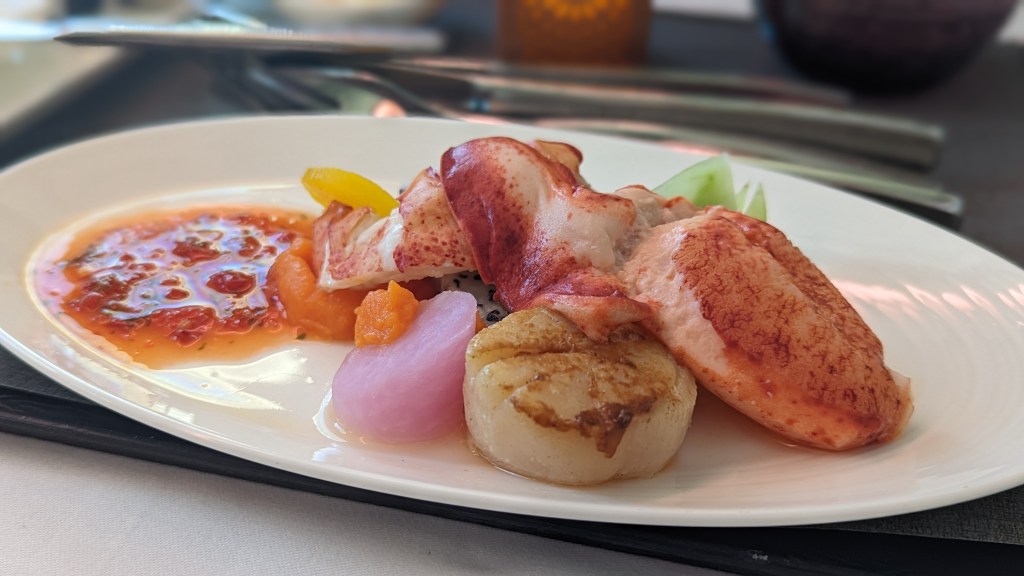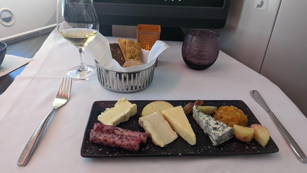 As this was a daytime flight, the main meal service was lunch which was a 5 course affair comprising soup, an appetizer, main course, cheese, dessert and a selection of breads. I wasn’t super hungry after wasting some tummy space on a terrible lounge experience (more on that below) so settled for the soup (a seafood bisque), an appetiser of poached lobster with seared scallop and a cheese plate. The bisque was a standout, hot and full of flavour, and went very well with the warm trio of artisan breads. Alongside, I chose a delicious J Vineyards Chardonnay and with my cheese a 20 year old Dow’s Tawny Port – a very decent and pricey drop, generous of Qatar to include this on their wine list!