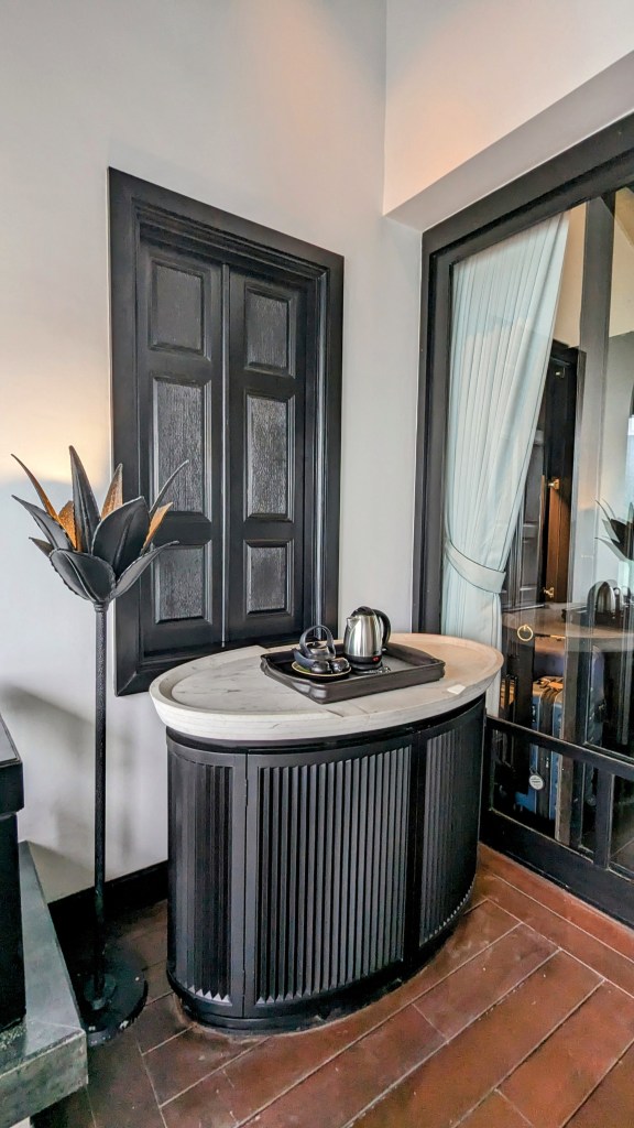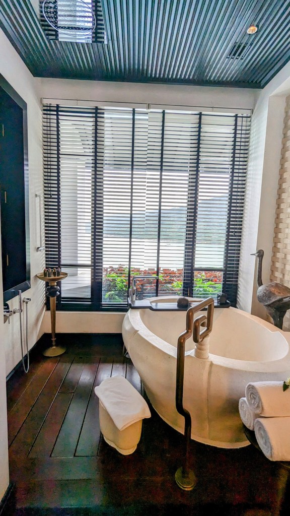 The huge bathroom connected to the bedroom via sliding doors and was decked out with a lot of marble and an art deco flair. We LOVED the “egg” bath, complete with friendly ostrich statue gazing thoughtfully out at the ocean! There’s also a separate toilet room so you can close the curtain and have some privacy while doing your business.