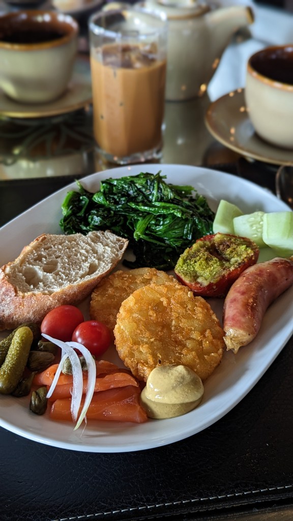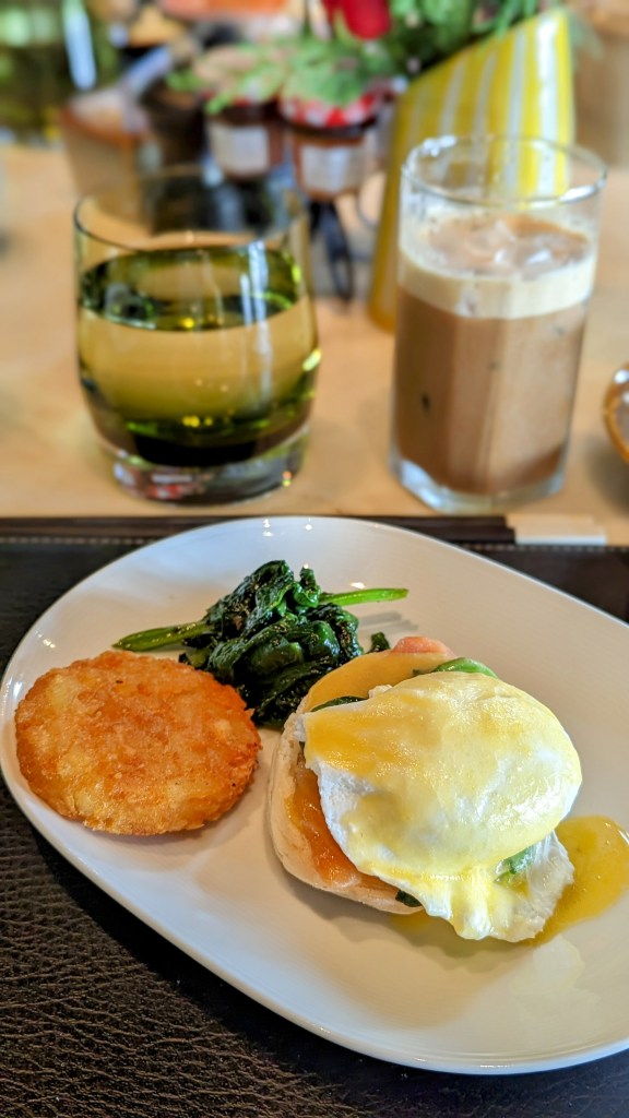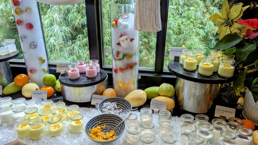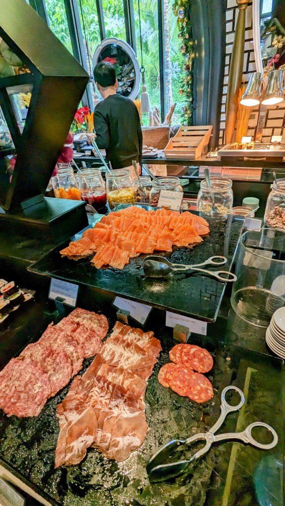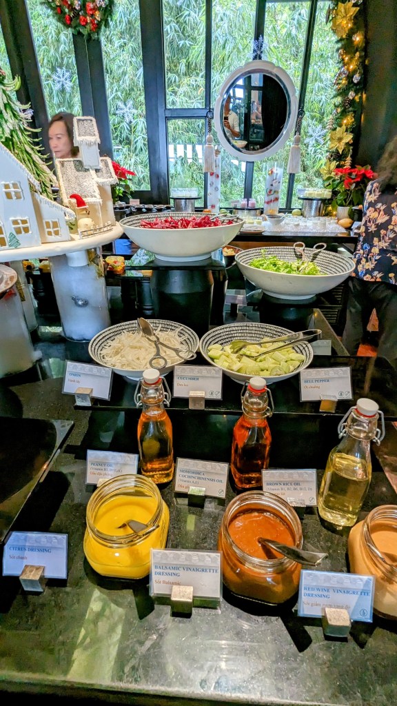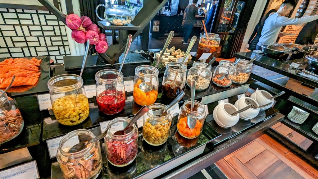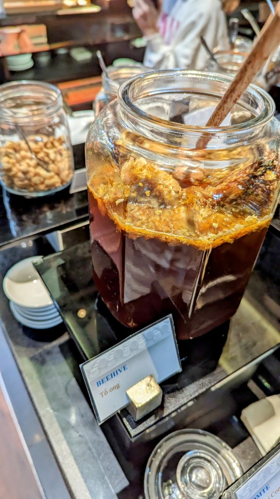 Firstly the variety – a chef manned egg station (including more fancy options like eggs benedict), bakery, exotic fruits, Western grill (hashies, mushrooms, eggs, beans etc), sushi bar, a fresh juice bar, granola and yoghurts with more compotes and fruit toppings than I even knew existed, cold meats and charcuterie, honeycomb, a daily changing chef manned Vietnamese noodle station, congee with all the toppings etc etc.
