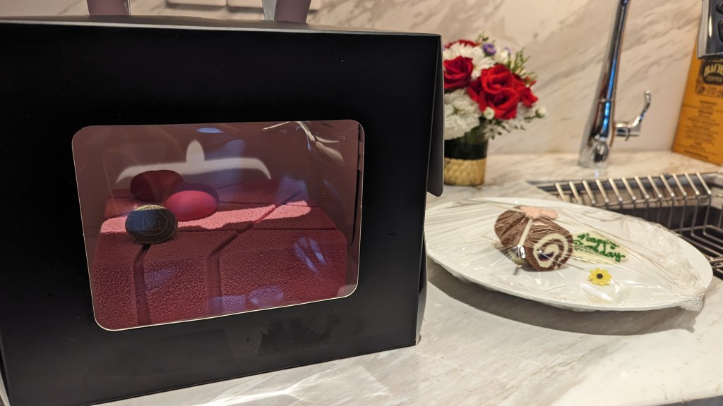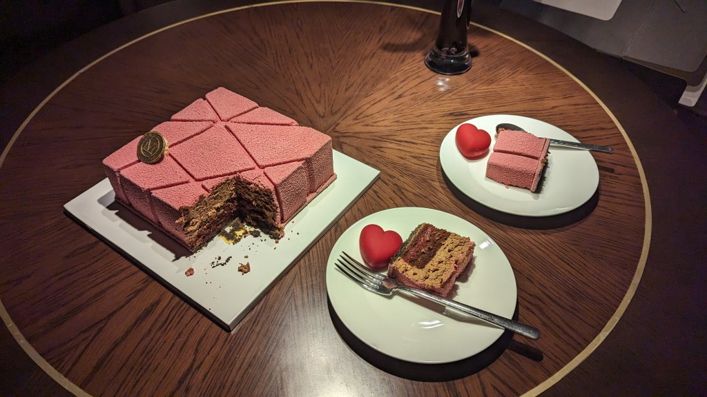 It was my partner’s birthday and so they sent up not one, but TWO cakes. A smaller chocolate roulade accompanied by an incredibly decadent chocolate and raspberry cake as we are members of their loyalty program. It was absolutely delicious but honestly a bit excessive and ended up having to throw most of it away – it could have fed a gathering of at least 10 people.