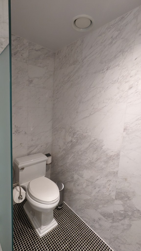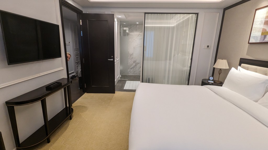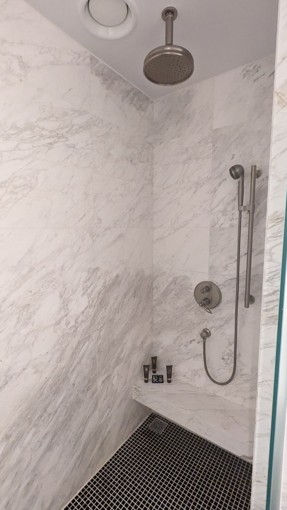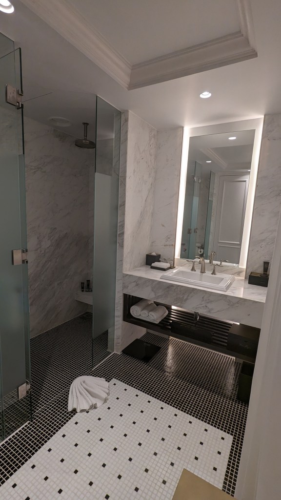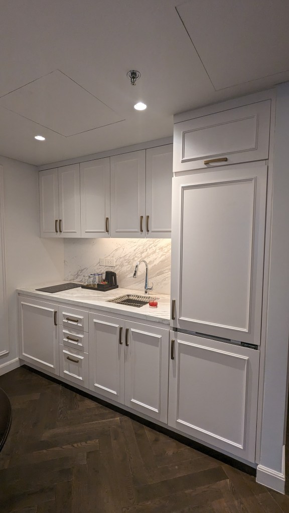 The adjoining bedroom was just as grand, fulfilling all ones’ plush, white hotel bed dreams. The interiors were very French colonial meets New York grandeur, and we felt like we were channeling serious Diane Lockhart vibes (for all you Good Fight fans) getting to wake up there every day. I loved touches like the ornate analogue bedside clock – it felt like the designers purposely opted for a more old world, authentic feel instead of pandering to the business traveler.