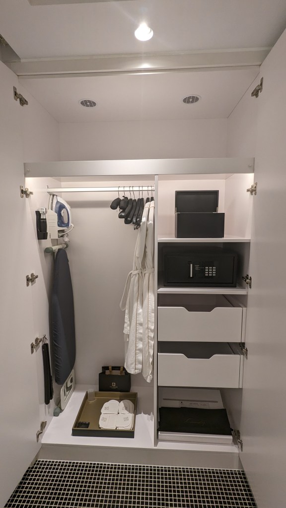 The ornate marble and grand style continues on in the bathroom, and you’ll also find an enormous closet to hang your clothes, safe, bathrobes, slippers, ironing board and even a jewelry box! Roberto Cavalli amenities are provided and in keeping with the vibes of this hotel, they don’t skimp on either the quantity or range – you’ll find anything and everything you might need from toothpaste to shampoo, soap, combs, shavers and sanitary bags.