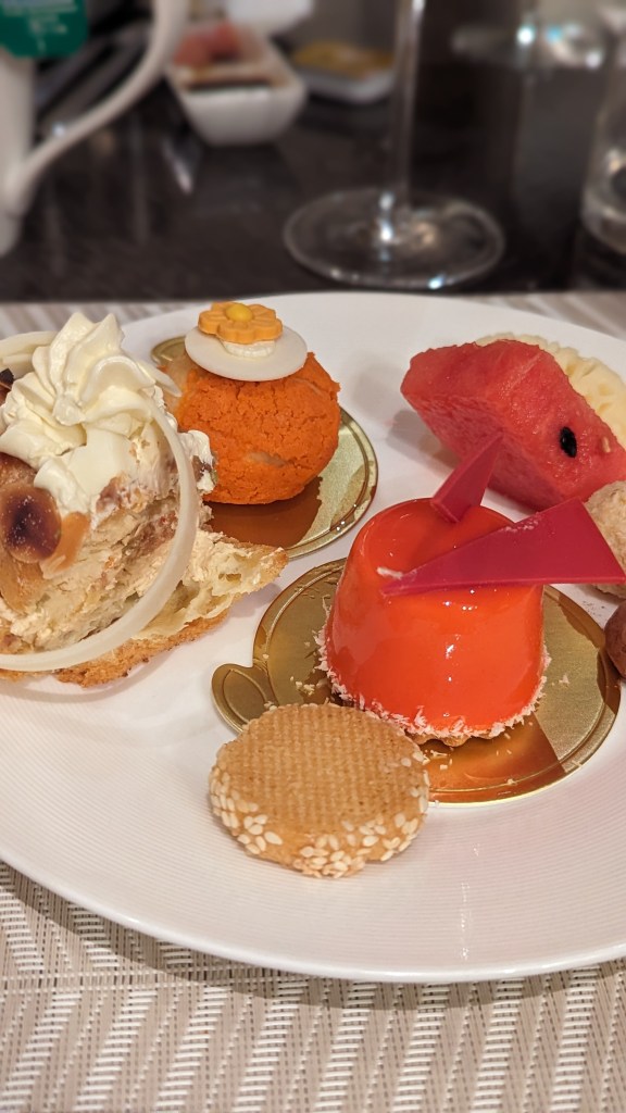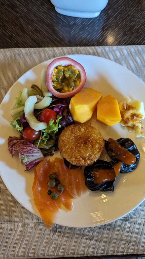 …and now I’ll have to switch back into slideshow mode because there’s just too many more to get through (noodles cooked to order, various cooked dishes, salads, pastries, fruit, cheese, cakes, ice cream, a chocolate fountain!!). I really enjoyed the Vietnamese style salads they had on offer – particularly one with peashoots and prawns, tossed in nuoc nam. No boring salads here!
