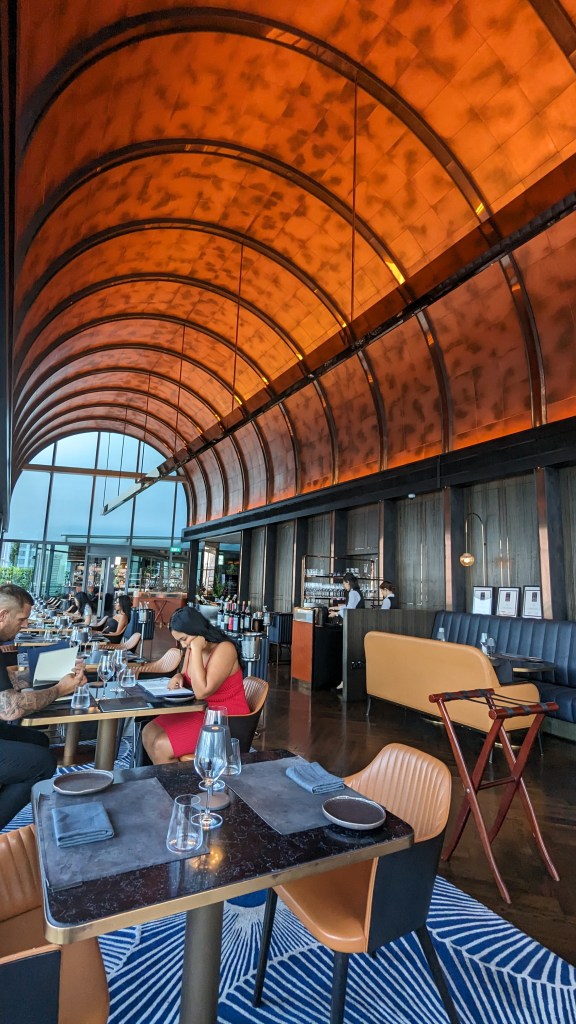At night time, the restaurant and view takes it up a notch. The indoor lighting showcases the beautiful bronzed vaulted ceiling, casting a luxurious glow over the entire restaurant creating an almost art deco feel.