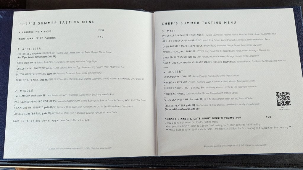 We opted for the four course Sunset Dinner Prix Fixe, only available for the first (5.30pm) and last seating (9.30pm) of the night. I’d booked us in the first seating so we could enjoy the view transitioning from daylight into night time!