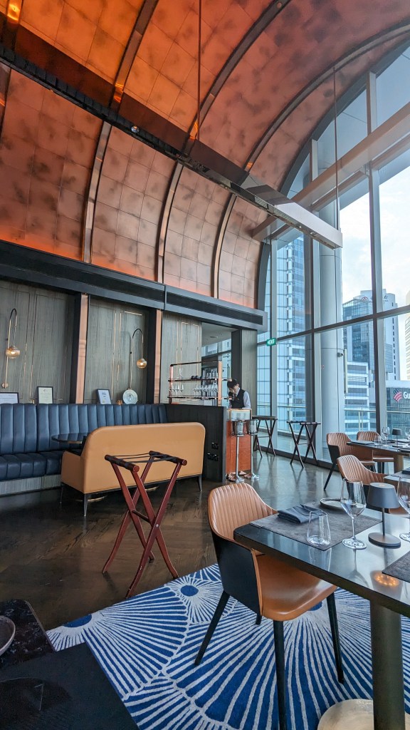 After much second guessing and reading every menu with a .sg domain on the internet, I eventually settled on Vue – mostly because of the view (no points for guessing where the restaurant’s name comes from!). Vue is a modern European restaurant and wine bar located on the 19th floor of the OUE Bayfront building in Collyer Quay, offering panoramic views of Marina Bay and Singapore’s glittering city skyline. The restaurant features an incredible copper vaulted ceiling over the entire interior, complete with floor-to-ceiling windows that enable all diners to enjoy the view whilst eating. Vue also has an outdoor terrace and a dedicated whisky lounge housing over 150 labels for those keen to enjoy a casual drink rather than a sit-down affair.
